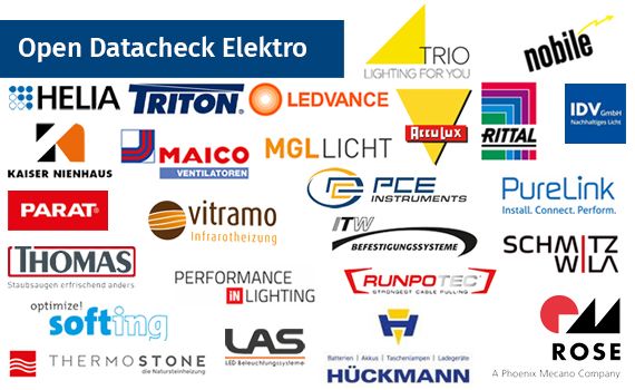 Mit Unterstützung des Open Datacheck Elektro Service Teams wurden bereits für ABL Connectivity, ABL GmbH, ASSA ABLOY Sicherheitstechnik, Bosch Thermotechnik GmbH Junkers, BS Bodensteckdosen Systemtechnik GmbH, e+p Elektrik Handels GmbH & Co. KG, EFB Elektronik GmbH, Elektra Tailfingen Schaltgeräte GmbH & Co. KG, ETHERMA - Elektrowärme GmbH, Friedrich Schultze GmbH, FRISCH-Licht GmbH & Co. KG, Haupa GmbH, IDV Import- und Direktvertriebsges.mbH, LAS Systeme GmbH, LEDVANCE GmbH, Maico Elektroapparate-Fabrik GmbH, MGL Licht GmbH, PARAT Solutions GmbH, Performance in Lighting GmbH, PureLink GmbH, Robert Thomas Metall- und Elektrowerke GmbH & Co. KG, RUNPOTEC GmbH, Thermostone GmbH, TRIO Leuchten GmbH, TRITON Chemnitz GmbH, Vitramo GmbH und Witte + Sutor GmbH Daten aufbereitet und dem Großhandel zur Verfügung gestellt.